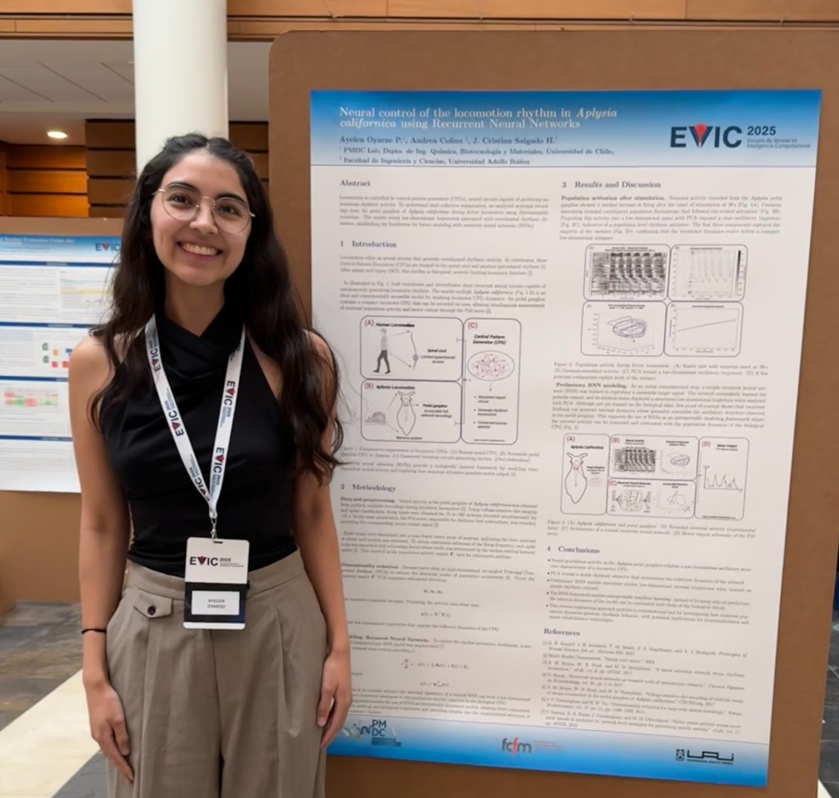 En tanto, en EVIC 2025, además del primer lugar obtenido por Javiera Rojas Meza, participó Ayelen Oyarzo, estudiante de Ingeniería Civil en Biotecnología, quien presentó su proyecto “Neural control of the locomotion rhythm in Aplysia californica using Recurrent Neural Networks”. Su investigación analiza registros neuronales del ganglio pedal de Aplysia californica para estudiar las dinámicas rítmicas asociadas a la locomoción y emplea redes neuronales recurrentes (RNN) como herramienta de modelamiento computacional para comprender el control neural del movimiento.